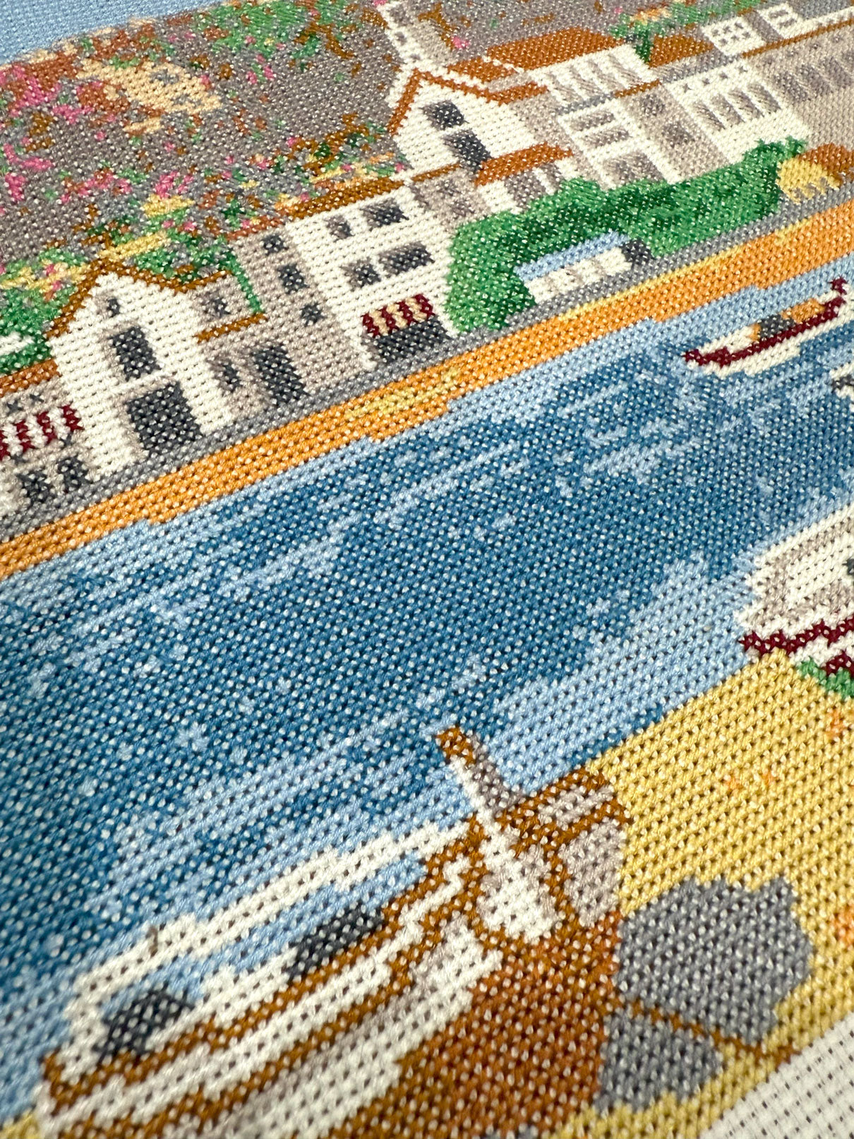 A peça "Costa Italiana" é uma encantadora composição em ponto de cruz que retrata uma vila costeira mediterrânica com delicadeza e cor. O cenário apresenta casas brancas com telhados em tons quentes, barcos ancorados na areia e um mar calmo que reflete o céu azul. Ao fundo, colinas salpicadas de vegetação completam a paisagem pitoresca.