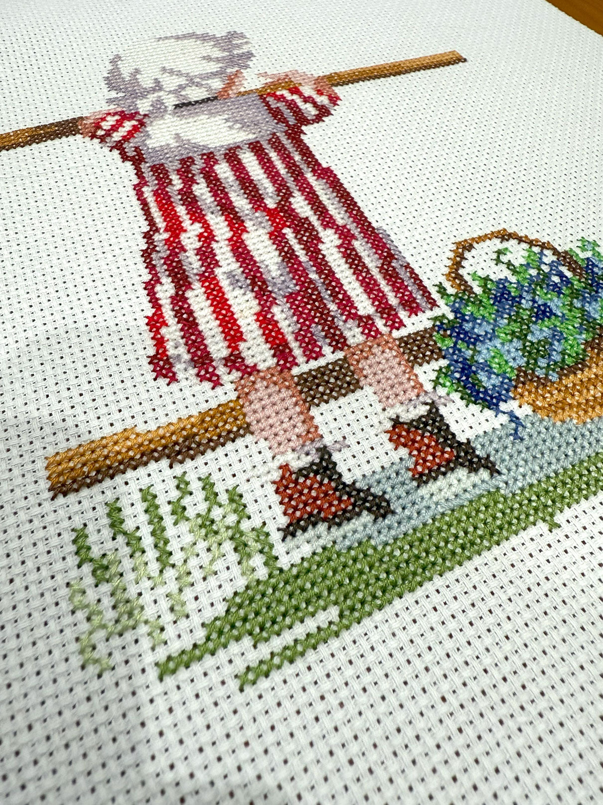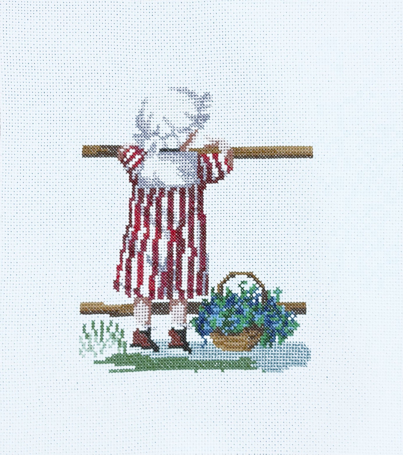 A peça "Criança Curiosa" é um delicado bordado em ponto de cruz que retrata uma criança de costas, apoiada numa cerca de madeira e observando o mundo além. Com um vestido às riscas vermelhas e brancas, e acompanhada de um cesto cheio de flores azuis, a figura transmite uma atmosfera de inocência, serenidade e encanto campestre.