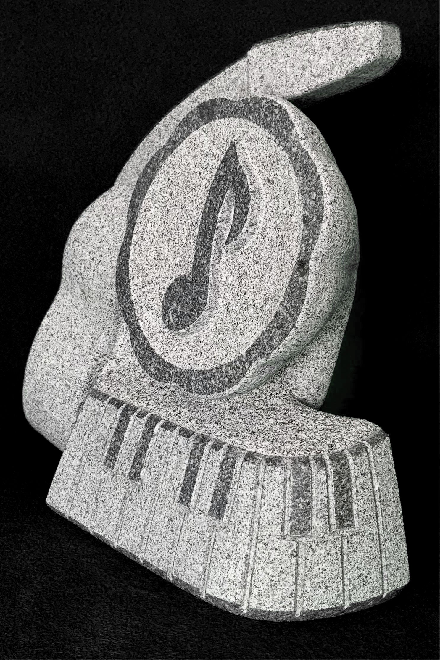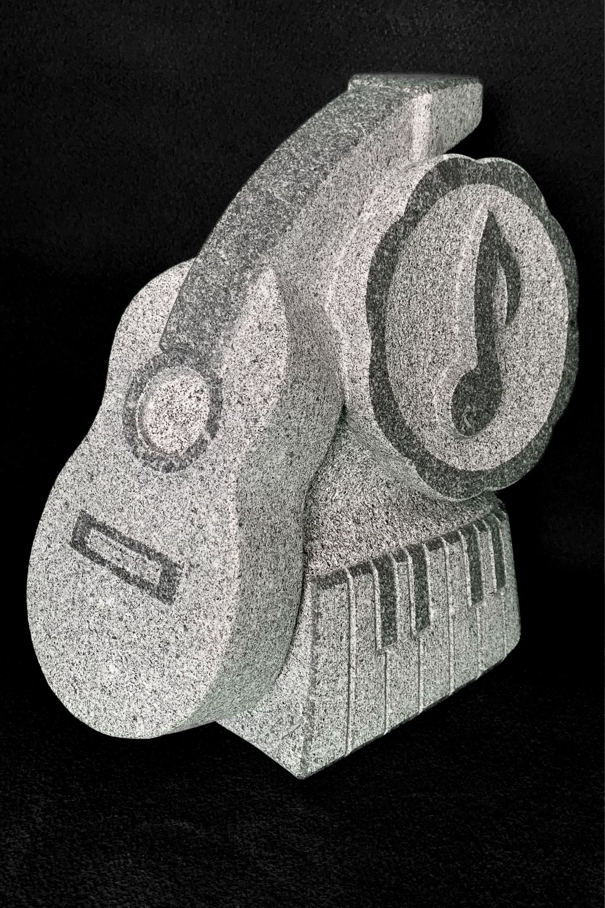 A escultura "Desconcerto" é uma peça artística esculpida em granito que engenhosamente funde elementos musicais com design abstrato. Esta obra apresenta um grande símbolo de nota musical envolto em uma estrutura que lembra uma face, complementada por um teclado de piano na base, criando uma metáfora visual para a música que define ou "desconcerta" a expressão da figura.